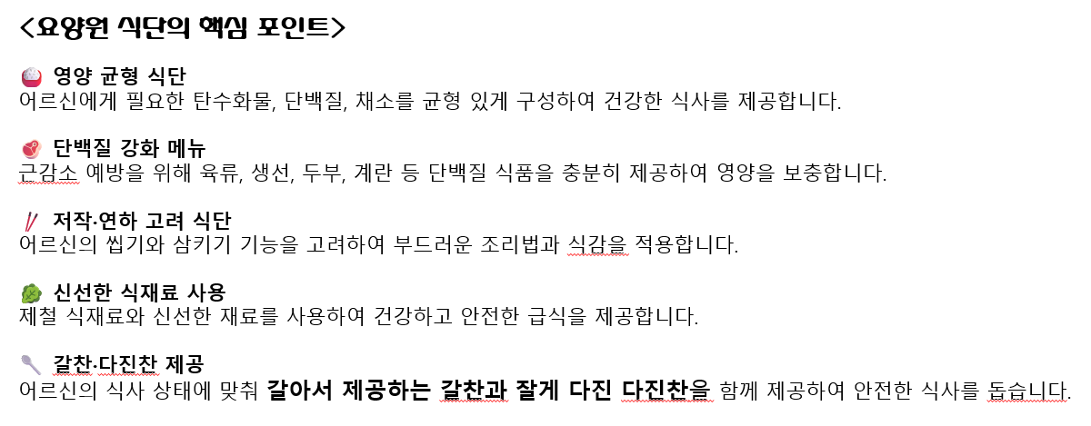 제공합니다. 어르신 한 분 한 분의 건강한 식생활을 위해, 정성과 책임감을 담았습니다.